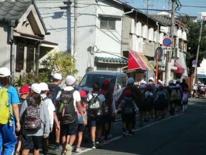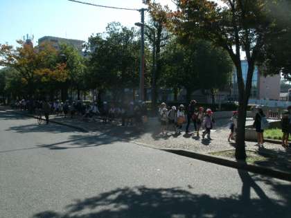 朝会の隊形に集合し、なかよし班に並び替え、班ごとに学校を出発しました。長い道のりを歩き、長居公園に着くと、木々が色づいていて、秋の雰囲気が漂っていました。