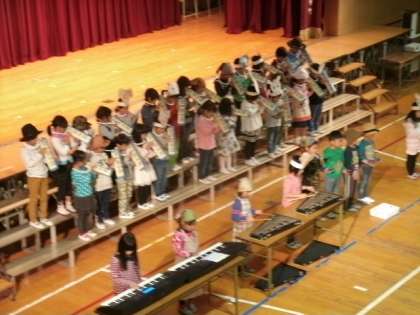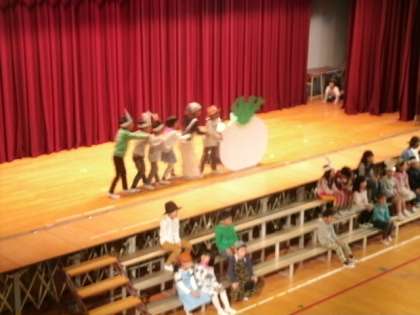その後、1年生から発表を始めました。4月の入学当初は、初めての学校生活に戸惑うことも多かったと思いますが、これまでの学習で身に付けたことを合奏と劇『大きなかぶ』を通して発表しました。合奏では落ち着いてみんなで合わせることができました。劇では、普通の劇ではなく音楽を織り交ぜ、大きな声で台詞を言ったり、歌を歌ったりしていました。