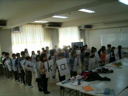 上の写真は、2時間目にランチルームでした練習の様子です。以前、図工の時間に作成したアルファベットを持って演技しています。さて、どんな演技かは、明日の本番を見てのお楽しみです。
