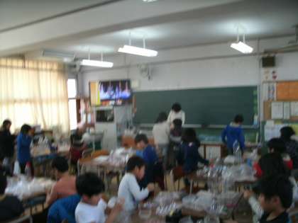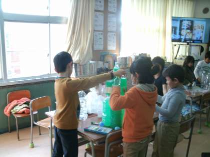 学習中にクラスを見渡すと、誰一人、ぼーっとしている子はいません。どの子も、没頭して作っていました。容器を切ったり、セロテープでくっつけたり、高く積み上げたり、細かいところまで切れ込みを入れたり、色水を入れたり・・・。そして、ロケットや船、家、お城など、大人のイメージでは収まらないいろいろなものが形作られていきました。子ども達の想像力、創造力はとても豊かで驚きました。