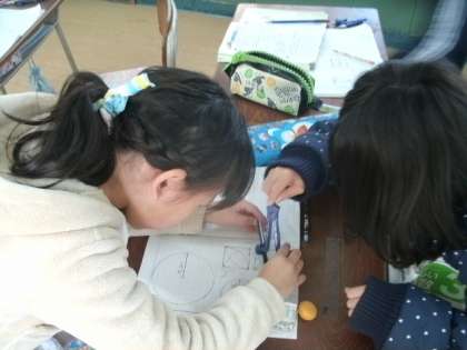 教科書に載っている模様を見て、どこにどんな円が隠れているか見つけ、円の中心を探しました。中心がわかれば、模様を描くことができます。早く描けた人は、自主的に困っている人を助け、教え合いをしながら、模様を完成させていました。