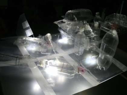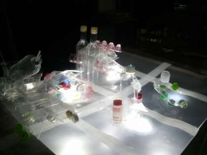 大会議室に移動し、暗くした中で、作品の下からライトを当てました。すると、明るい教室で見た時の作品とは一味違い、学習のテーマの『クリスタルファンタジー』にふさわしいファンタスティックな作品の数々が浮かび上がりました。