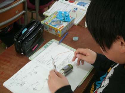理科では、明かりについて学習しています。今日は 乾電池と豆電球を使い、どのような時に豆電球に明かりがつくか調べました。