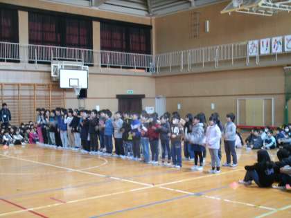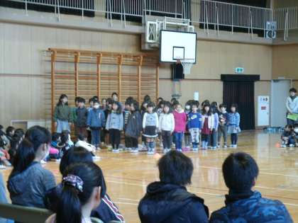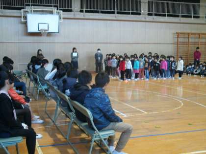 2年生は、「今までありがとう!これからもがっばってください。中学校に行ってもたくさん友達を作ってください。」という思いをこめて、手話を使った歌『友達になるために』をプレゼントしました。