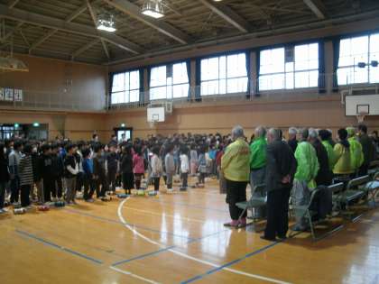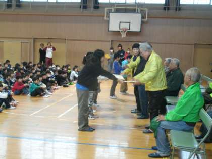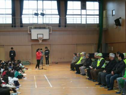 全校児童を代表して児童会から「いつもお世話になってありがとうございます。これからも元気でいてください。」とお礼を言いました。その後、学年代表の子ども達が感謝状を手渡し、「きみに会えて」の合唱をプレゼントしました。最後に、見守り隊の方から「交通ルールを守って交通事故に気をつけましょう。元気よくあいさつしましょう。」とあいさつがありました。