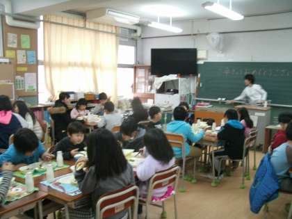 今日の給食の時間、6年生がやってきて、いっしょに給食を食べました。6年生はあと2週間で卒業します。その6年生との思い出を作ろうということで、今日『卒業交流給食』が行われたからです。
