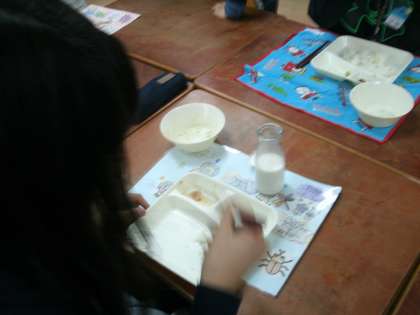 ※6年生の給食の下に敷いているのは、子ども達が心を込めて書いたメッセージをラミネートした特製ランチョンマットです。