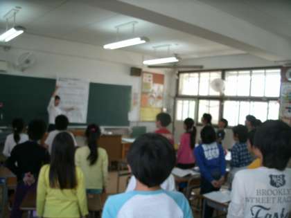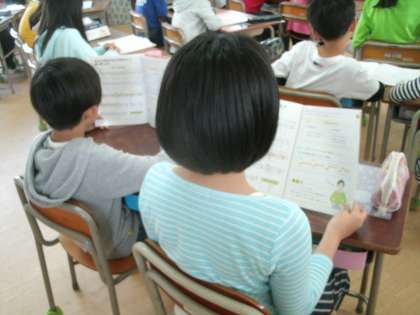 真新しい音楽の教科書をていねいに開け、気持ちも新たに『ゆかいに歩けば』を歌いました。この歌は、途中から高い音域が出てくるので、普通に歌っていたのではその音域まで歌声を高めることができません。そこで、担任から「目と口を大きく開けて歌いましょう。」などのアドバイスを受けて練習を重ねていきました。