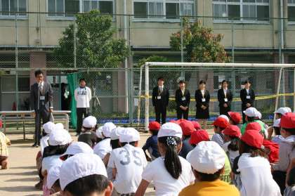 昨日の長い雨がようやく上がり、運動場で児童朝会がありました。