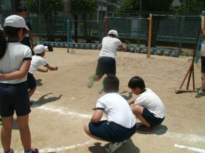 自分の体力を知り、意欲的に体力向上を目指そうとする態度を育てるために、先月終盤から新体力テストを実施しています。今日は、幅跳びとソフトボール投げをしました。