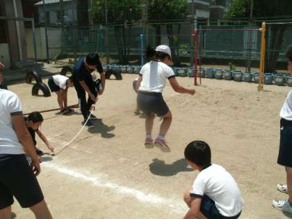 幅跳びでは、練習をした後、早速測定をしました。できるだけ遠くに着地するように手を大きく振って反動をつけ、思い切り跳び上がります。そして、着地。すかさず、測定係がメジャーで測定します。その後、整地係がとんぼで整地し、次の人がジャンプ。さすが4年生ともなると、自主的に幅跳びを実施することができました。