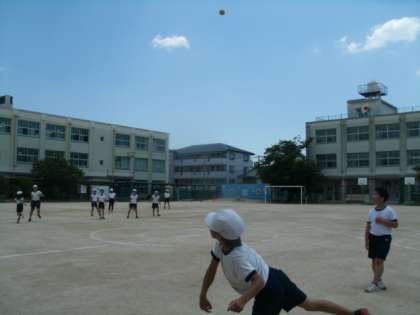 その後、ソフトボール投げをしました。今回は練習だけで、次回が本番です。投げる組とボールを拾う組に分かれ、順番に投げていきます。「さがれ!さがれ!」と拾う組の人が声を張り上げるぐらいのボールを投げる人もいて、本番で記録を測定するのが楽しみです。