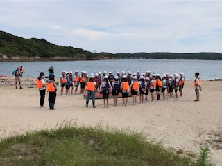砂浜で指導員の方からシーカヤックの乗り方を教えてもらっています。