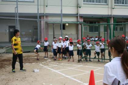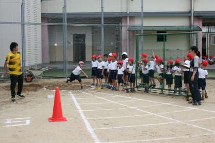 でも、当然ですよね。ソフトボール投げなんて初めてだし、日ごろはもっと大きなボールで遊んでいるのですから。それでも、一生懸命に先生の指導を受けながらがんばっています。がんばれ、がんばれ1年生!!!