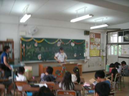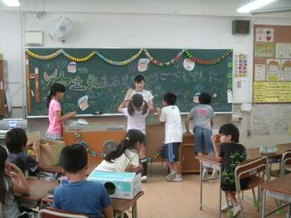 昼休み、玄関掲示作成の作業を終えた実習生が教室に入った瞬間、お別れ会が始まりました。何も知らない実習生。通常の授業が始まると思っていただけに、しばらくの間何が起こっているのかわからず、戸惑いの表情が見られました。しかし、すぐに顔がほころび、子供たちとの笑顔あふれる楽しいお別れの会が始まりました。