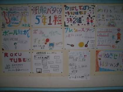 夕方写真を撮ったので少し見にくいですが、今、職員室前の掲示板に、各クラスから出された東小フェスティバルのポスターが貼られています。また、授業中や休み時間、放課後に廊下を歩いていると、東小フェスティバルの準備をしている子供たちの姿をよく見かけるようになりました。
