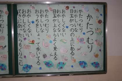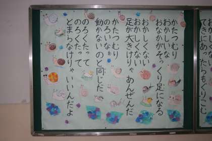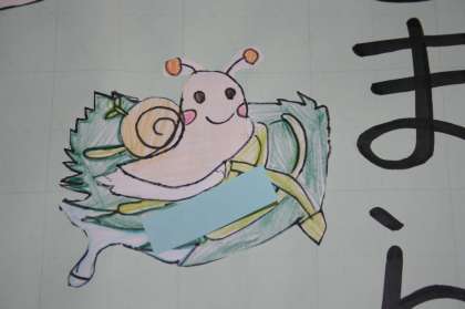 リューユイ(中国)さんの詩の後ろにアジサイとカタツムリがうかんでいます。カタツムリは各自がデザインしたのでしょう。どれも個性的でこの詩にぴったりしています。