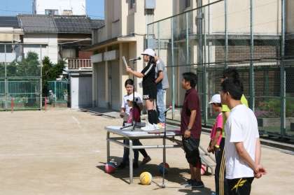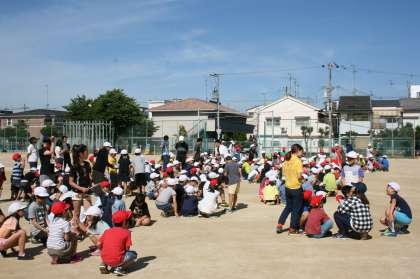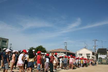 班ごとに集まって今日のお題を待ちます。委員の人が「先生の名前あてゲーム」と発表。