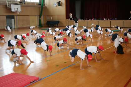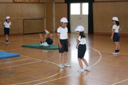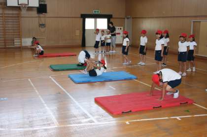 準備体操、足うち、ブリッジなどをした後、前転・後転の練習です。