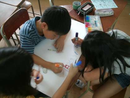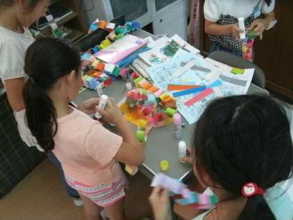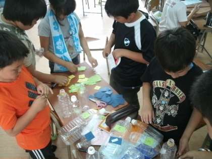 あるグループはお客さんに渡す景品を作っています。視線を他のグループに向けるとルールを書いています。また違うところを見るとペットボトルに番号を貼っています。早く準備が終わると、今度はお客さんが来たことを想定してリハーサルです。
