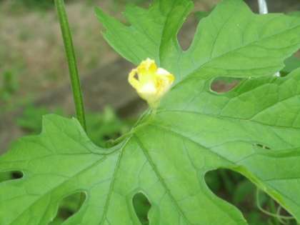 ゴーヤの実は、ごつごつしていて、食べると苦いです。そこからはイメージできないかわいい花です。