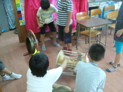 その後の昼休み、朝鮮子ども会の教室に行き、トゥホやペンイを使って遊んだり、チャンゴやケンガリなどの楽器を演奏したりして、韓国朝鮮の文化にふれました。