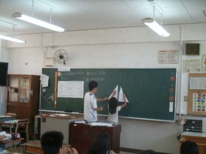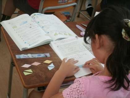 「できた2つの三角形は形も大きさも同じだ。」「三角形をくっつけると平行四辺形になった。」など、はさみで切り取った図形を実際に動かしながら、図形の特徴について理解を深めていきました。
