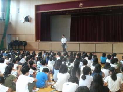 全校で元気よく校歌を歌った後、校長先生から「夏休みには、ふだんの学校生活ではできないことをしよう。」「計画的に過ごそう。」「夏休みを振り返った時、いい夏休み、何かがんばれたぞというきらりと光る夏休みにしよう。」という話がありました。
