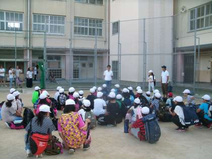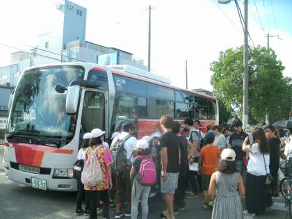 午前7時20分、「おはようございます。」の声が校庭に響き渡りました。夏休みに入ったばかりですが、今日、5年生が神鍋高原での林間学習に出発しました。