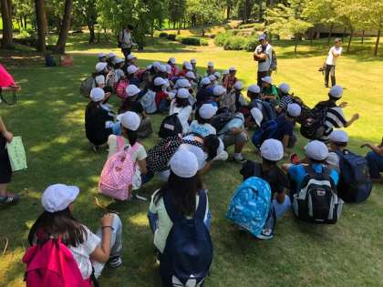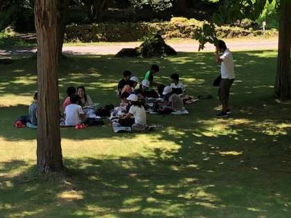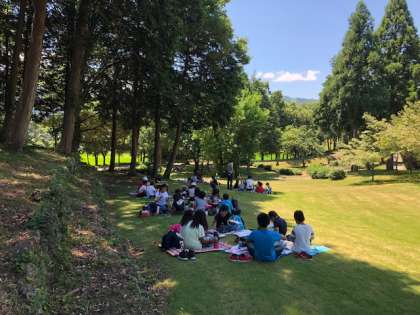 植村直己冒険館の敷地内の木陰で昼食中です。