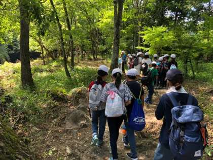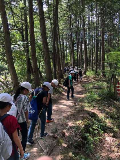 マイクロバスに乗って、せせらぎ淵に到着しました。稲葉川に沿って歩き、まずは風穴、畳滝、溶岩瘤、二段滝を目指して、川沿いの木陰の道を進んでいきます。