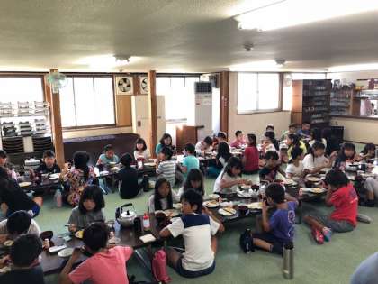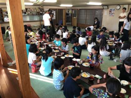 子供たちは今日の活動に向けて、しっかりと朝ごはんを食べていました。今からは部屋に戻って荷物整理をしてから、うどん打ち体験をします。