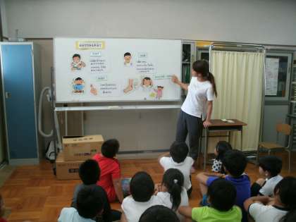 ※ 写真は、養護教諭から「保健室に来る前に自分でできるけがの処置の仕方」をテーマにした保健指導を受けているところです。