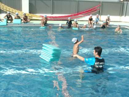 それから、水の上に置いた揺れるビート板にどんどんビート板を積んでいく『たおしちゃ〜、ダメ!ダメ!』をしました。いつ倒れるかハラハラドキドキ。波で揺れて倒れてしまうと、周りから「わぁー!」と残念がる声。でも、すぐ気持ちを切り替えて積み始めていました。