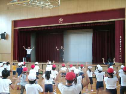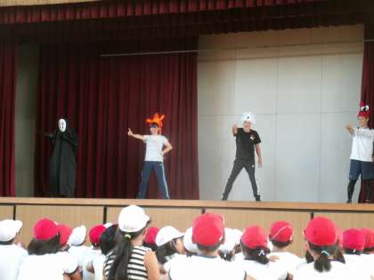 今日から3年生と合同で、運動会に踊る団体演技のダンスの練習を始めました。今日は初日ということでスペシャル講師を招いて、ダンスを見せてもらいました。スペシャル講師は、ジブリ映画の顔なしさん、エビさん、ハクチョウさん、カニさんで、舞台に登場すると、子供たちから大歓声!手拍子が自然と起こり、子供たちからは笑顔があふれていました。
