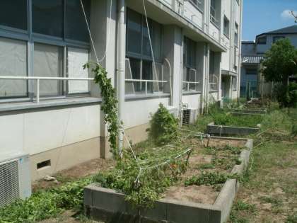 子供たちに多くの実りや楽しみを与えてくれた学習園、ゴーヤ、小玉スイカでしたが、昨日の台風で大きな被害を受けました。ゴーヤについては、2階の窓まで伸びて見事な緑のカーテンを作っていましたが、ほとんどのロープが切れてカーテンではなくなってしまいました。小玉スイカの方は、茎が根元から切れて風で吹き飛ばされ、地面が露出している状態でした。