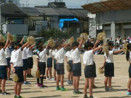 プログラム11は、3・4年生による団体演技「shine〜one for all all for one〜」でした。キラキラポンポンを持ち、キラキラベンダナを巻いて、リズムに合わせて体を大きく使って踊ると、演技の名前通りshine:輝きに満ちたダンスになりました。