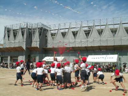 プログラム13は、1年生による団体競技「玉入れ」でした。子供たちが描いた願い旗が風に揺れる青空に、赤白の玉が飛び交いました。競技途中のチェッコリーのダンスも見どころでした。