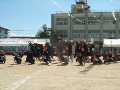 午前の部最後のプログラムは、5年生による団体演技「魅せろ!Yatahigashi ソーラン46」でした。歌謡曲でソーランが始まり、その後、伝統的な力強いソーランに。趣向を凝らした新しいソーランを披露していました。