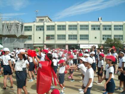 午後の最初のプログラムは、本校の特色の一つである異学年交流をめあてとした「なかよしボール送り」でした。異学年集団であるなかよし班ごとに並び、頭の上、体の横、股の下などを通して後ろの人にボールを送っていきました。途中、上級生が下級生のサポートをする様子が見られ、異学年のふれあいが深まりました。