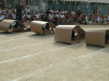 プログラム20は、4年生による障害物競走「キャタフラドンハー」でした。キャタはキャタピラ、フラはフラフープ、ドンはドンゴロス、ハーはハードルを意味します。それぞれの障害物に持てる力を発揮して挑み、ゴールを目指していました。