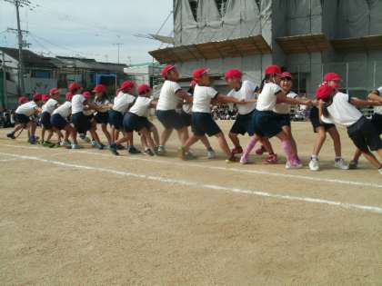 プログラム21は、3年生による団体競技「つなひき〜輝く明日を手に入れろ!引っぱれ3☆シャイン!!〜」でした。これが3年生なんだという元気いっぱいの学年のカラーが出た競技でした。太い綱からミシミシと音が聞こえるくらい力を込めて引っ張り合っていました。