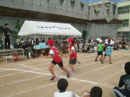 プログラム22は、5年生によるリレー「バトンをつないでLet's 5」でした。ゴール直前で順位が入れ替わるなど、目が離せないデッドヒートしたレース。バックストレートで加速して前の人を抜く時などは、大きな歓声が上がっていました。