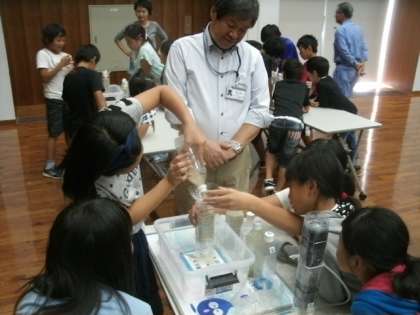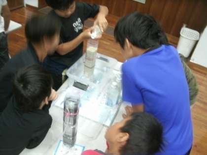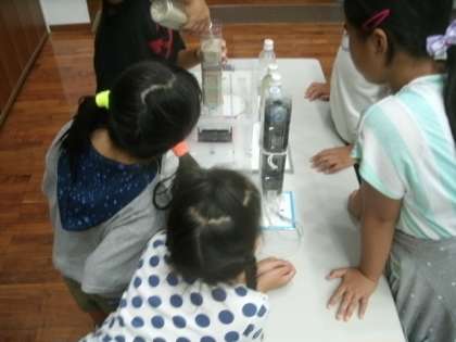 施設見学の後、大会議室で、実際に汚れた水をろ過する実験をしました。ペットボトルを使って簡単なろ過装置を作り、そこに汚れた水を入れます。出てきた水を見てみると、「うわっ、きれい!むっちゃきれいになってる!」の声が。今度は、活性炭を入れたろ過装置に青色の水を入れます。すると、「透明になってる!」と驚きの声が。目を輝かせながら実験に取り組み、水をきれいにする仕組みを学びました。