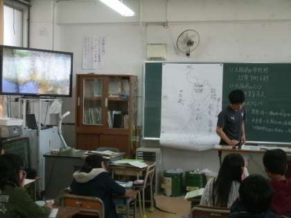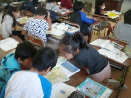 府内の人口、町の数、地形(西には大阪湾、琵琶湖を源流とする淀川、学校のすぐ南側を流れる大和川があり、金剛山地などの山に囲まれているなど)を、地図帳などをもとに調べ、ノートにまとめていきました。地図帳には細かな字でたくさんの情報が書かれているので、なかなか地名を調べることができないこともありました。その時は、友だちと協力して調べていました。