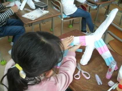 前回は、「針金ハンガーで骨組みを作り、新聞紙で作った身を新聞紙で包んで半紙でコーティングし、あとは色を塗ります。」とお伝えしました。