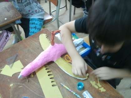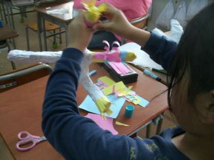 ごめんなさい。大きな誤りでした。作品展用の作品ですから、そんな簡単な仕上げで出展するはずがありません。羽が抜けていました。子供たちは画用紙で羽を1枚1枚作って糊で貼り付けています。根気のいる作業ですが、工夫してていねいに作業を進めています。