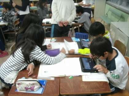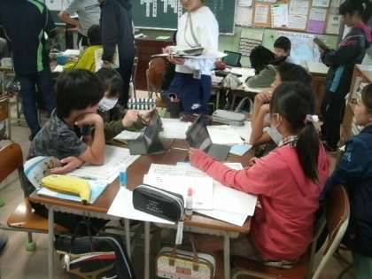『和の文化を受け継ぐー和菓子をさぐるー』で学習したことをもとに、チームで調べるテーマを決めてプレゼンにして発表するという、5年生の国語科の学習を参観しました。
