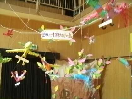 『世界に1羽だけの鳥』では、羽を1枚1枚糊付けしたり、配色や羽の形を工夫したりして、テーマの通り世界に1羽しかいないオリジナルの鳥を作成していました。針金ハンガーと新聞紙をもとに作った鳥とは思えないカラフルな鳥に仕上がりました。