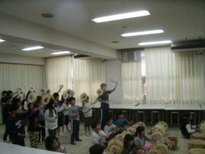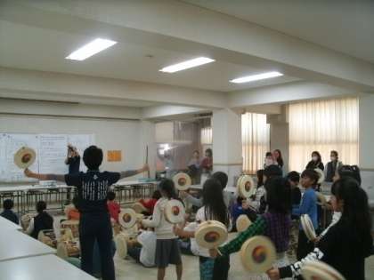 土曜授業の2時間目の参観では、課内実践でソンセンニムから教えていただいた『サムルノリ』の練習に取り組んでいるところを参観していただきました。ソゴ、チャンゴ、プッの3つの楽器を、ドレミで書かれた楽譜とは違う楽譜を見ながら練習していきました。でも、慣れてくると、楽譜も見ずに、体で覚えた感覚でたたける人が増えてきました。3つの楽器の音がそろうと、魂の叫びのような感じがして、何か、熱いものが伝わってきました。
